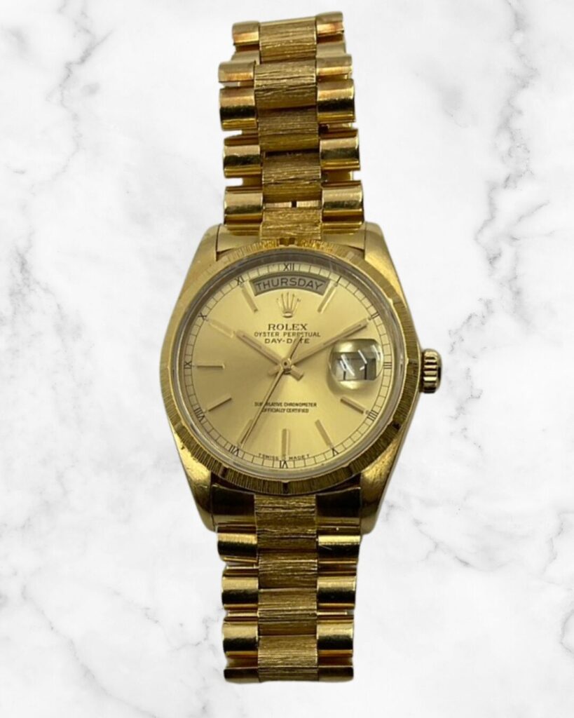 「デイデイト」は1956年に誕生したロレックスのフラッグシップモデルです。12時位置に曜日、3時位置に日付をフル表示する世界初の自動巻腕時計として登場し、ケースとブレスレットには貴金属のみが採用される特別な位置づけのモデルです。今回お預かりした個体は、イエローゴールドケースにプレジデントブレスレットを備えた、デイデイトらしい重厚感と気品を併せ持つ仕様です。